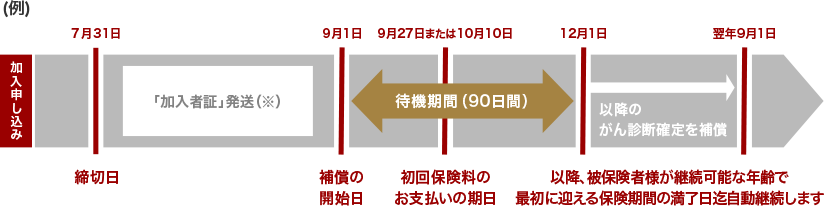 本商品のお申込みは、毎月末日締切となっています。毎月末日までにお申込みいただいた場合、補償期間は2か月後の1日午後4時(中途加入の場合も午後4時)から次の9月1日の午後4時までとなります。初回保険料は補償開始の当月27日または翌月10日(振替日はご契約のカードにより異なります)に通常のカード利用代金として自動引落しされます(金融機関休業日の場合は、翌営業日)。加入初年度に限り90日間の待期期間があります。