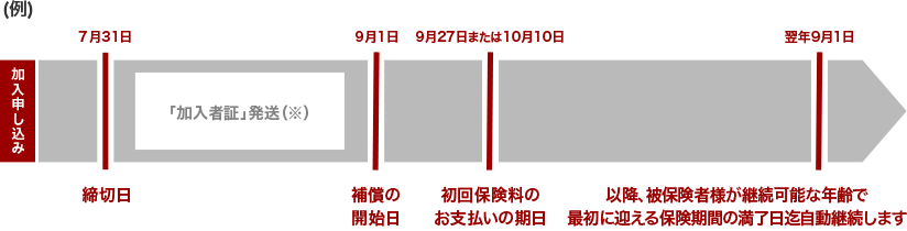 本商品のお申込みは、毎月末日締切となっています。毎月末日までにお申込みいただいた場合、補償期間は2か月後の1日午後4時(中途加入の場合も午後4時)から次の9月1日の午後4時までとなります。初回保険料は補償開始の当月27日または翌月10日(振替日はご契約のカードにより異なります)に通常のカード利用代金として自動引落しされます(金融機関休業日の場合は、翌営業日)。